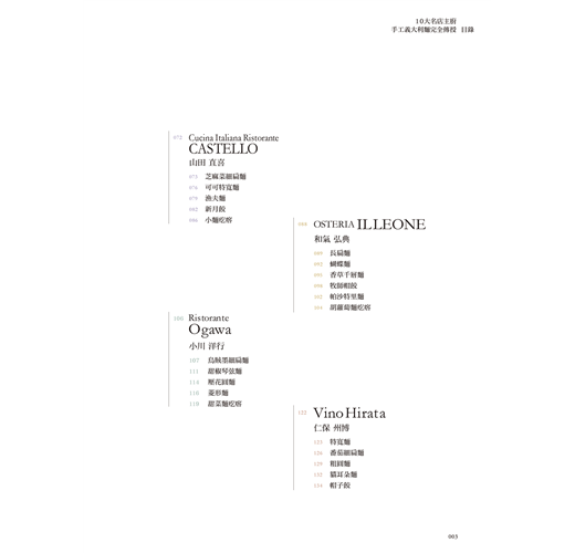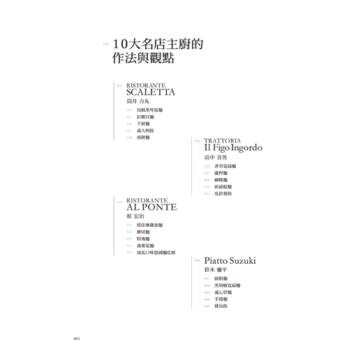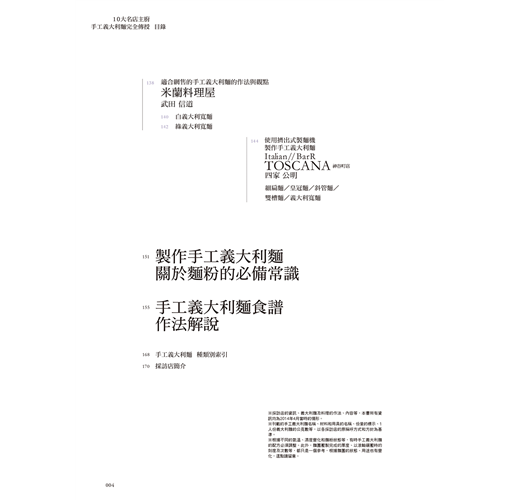 由於本書收錄多種手工義大利麵,所以特別於書末整理出「依照麵條種類」排序的索引。