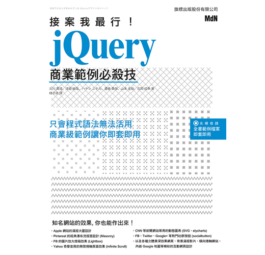 本書範例由一線的網頁設計師共同製作而成, 網羅了近幾年最熱門的 jQuery 經典案例。將教你如何活用各種現成的外掛程式, 大幅提升網頁開發效率。Step by Step 的詳盡解說加上可立即套用的絕妙範例, 讓你以更快的時間完成接案目標, 輕鬆贏得客戶青睞!