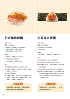 多層次口感的飯糰壽司,免除傳統用捲簾的製作方式,食材取材活用性高,便利性強、接受度高,適合親子同樂。