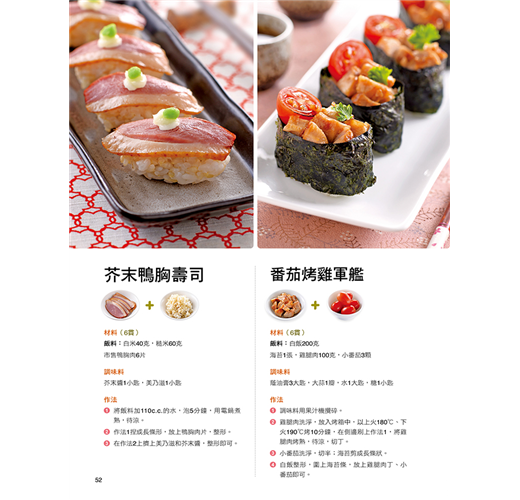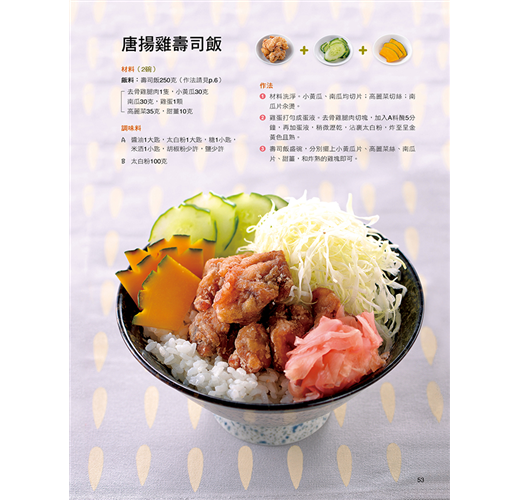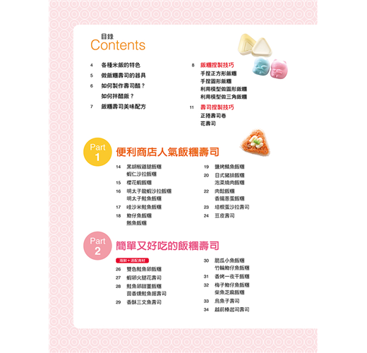 在家製作壽司、飯糰其實非常簡單,食材也容易準備且相當有變化,只要掌握小技巧,罐頭、市售菜餚、常備菜等,都可以變成美味的主食材,輕鬆變化出色彩繽紛、口味豐富的飯糰壽司。