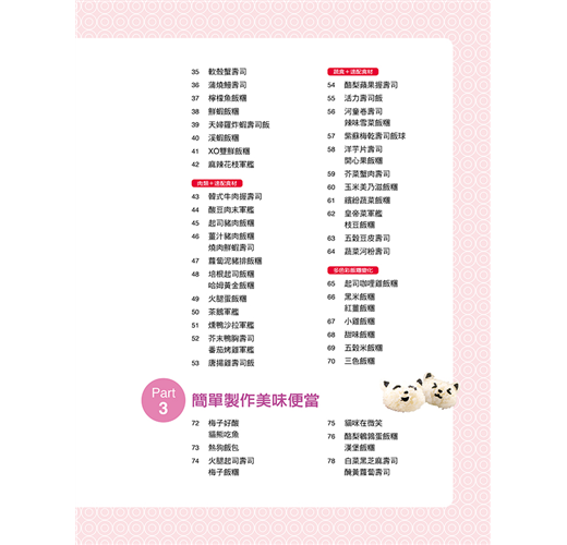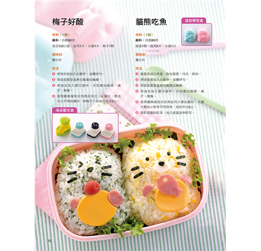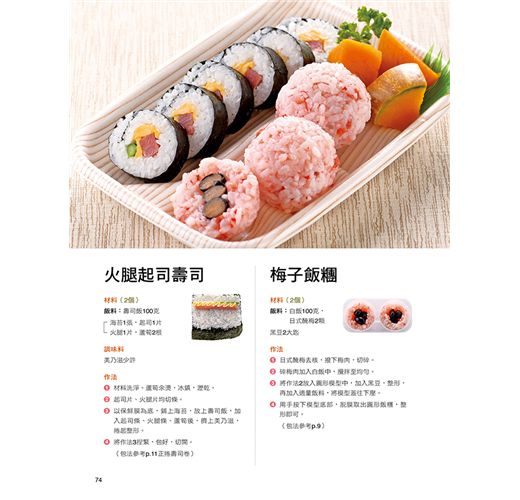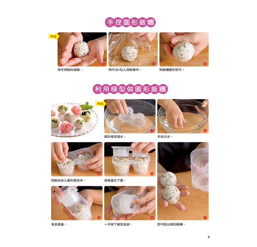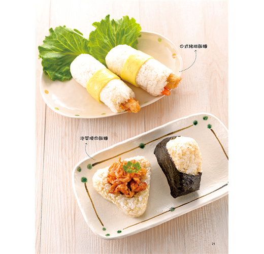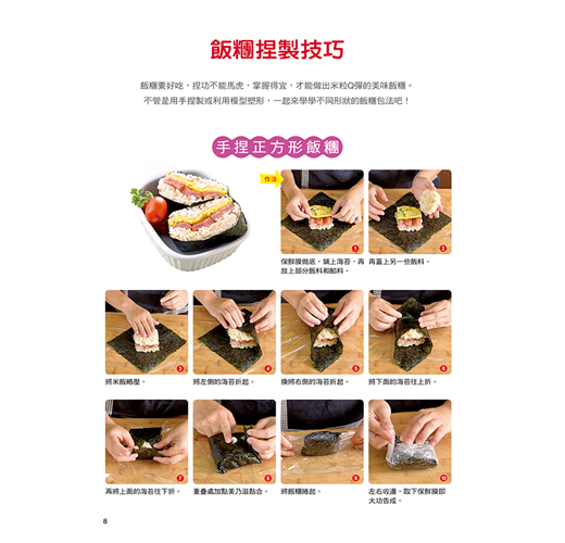 介紹多種飯糰(正方形、三角形、圓形、圓餅形等)和壽司的捏製技巧,製作方式簡單,適合全家人一起享受手作的樂趣。