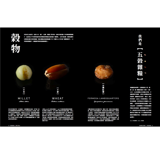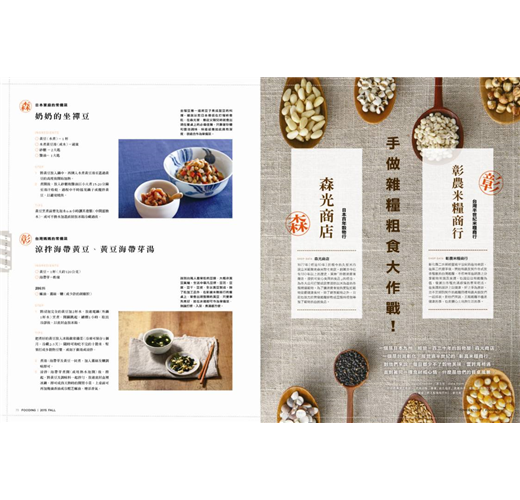 進入料理美學家貓兒的家,「小薏仁沙拉」、「綜合豆子濃湯」、「培根蔬菜藜麥厚蛋餅」等異國風雜糧一一上桌,等等還有谷斯谷斯喔,貓兒笑著說這些雜糧都是她平日餐桌上的尋常風景,可作為主食的雜糧,加點蔬菜們互相搭配,就是營養滿點的一餐;而在農夫柯雄能的家裡,幾乎隨時都可喝到「自然甜」的小麥茶,以無毒、友善農法種植的黑豆與小麥,喝來就是有股讓人魂牽夢縈的甘甜味,尤其小麥因麩粉層較厚,炒過後的香氣比以糙米製成的玄米更濃郁,只要喝上一口,那個……家裡的玄米茶就被乖乖收進櫃子裡了。來到永豐米糧行,店主人黃裕釗,從小就在五榖雜糧裡打滾,他說:「雜糧料理聽來樸素,其實變化十足。」請他示範幾道拿手菜,「指壓蕎麥貓耳朵」、「風飛沙style客家擂茶」、「好骨溜小米甜粥」等私食譜全分享,體貼用心的程度,就別說店裡還可根據家中老小、牙口好壞,體質寒燥、口味偏好等客製化調配的榖物了。