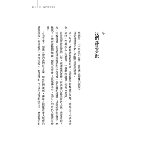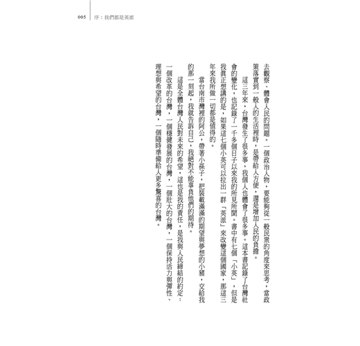 這三年來,台灣發生了很多事,我個人也體會了很多事。這本書記錄了台灣社會的變化,也記錄了一千多個日子以來我的所見所聞。書中有七個「小英」,但是我真正想講的是,如果這七個小英可以拉出一群「英派」來改變這個國家,那這三年來我所做一切都是值得的。
