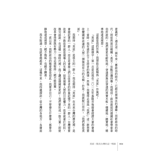 我期待「英派」是很大的一群人,我也期待「英派」在未來台灣的歷史裡,是會被記著的一群人,而且是會被人們以改革者的形象記憶下來的一群人。台灣需要改革,不敢改革就是領導人的失職。如果領導人想的只是權力,改革就會打折扣,換句話說,在這樣一個時代裡,為了讓這個國家更好,我們要形成一股力量,即使改革會得罪既有勢力,也必須堅持,絕不能放棄。