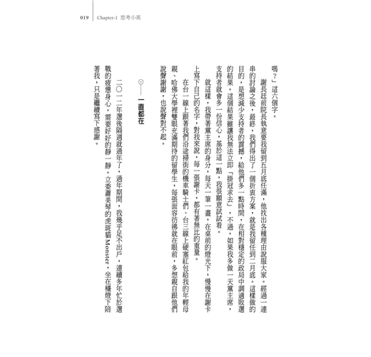 這是我當時真實的心境,在選舉的激情,與高潮的政治攻防之後,我要冷靜下來,沉澱反省,並且把這個國家的未來再做一個全盤的規畫。這個國家到底是什麼樣貌?台灣所面臨的問題、困境是什麼?而在那其中,我自己的角色又應該是什麼?