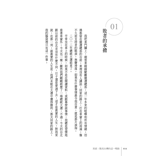 平常坐在車上的時候,如果不是在閱讀資料,或跟幕僚談事情,我總是習慣地看著車窗外。今天也一樣。雖然我們剛剛經歷了一場總統大選,不過,今天的台北跟以前的台北並沒有什麼不同。日子還是要過下去,這才是真實的人生。對我來說,在那一刻,最真實的人生是,我們未能在大選中獲得勝利。那天回家的路上,我的腦袋裡只有這一件事。