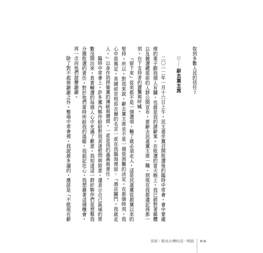 「留下來」從來都不是一個選項,輸了就必須走人,這是民進黨從創黨以來的堅持。所以,對我來說,辭去黨主席並不是一個很困難的決定。在那個時刻,我心中很篤定,英國前首相邱吉爾的名言一直在我腦海裡面:「酒店關門,我就走人。」以身作則捍衛黨的傳統與價值,一直是我的義務與責任。