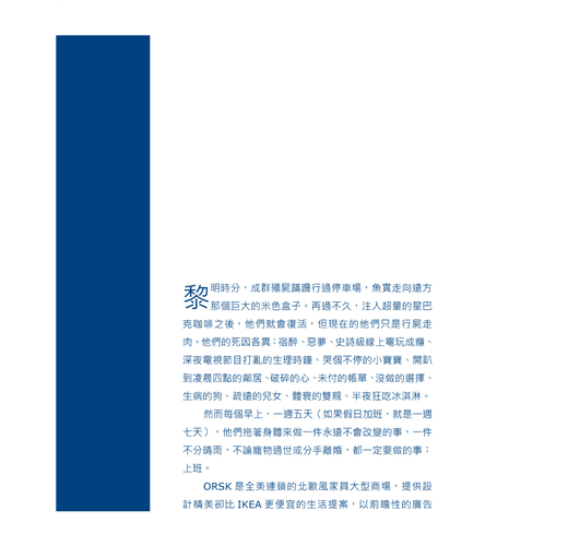 ORSK是一顆巨大的心臟,推動著三百一十八名員工(正職二百二十八人,時薪人員九十人),從它的心室展開一趟趟永不停歇的循環。每天早上,各樓層員工湧入,感應他們的ID卡,打開他們的電腦,然後開始幫顧客測量完美的Knäbble櫥櫃,找到最舒適的Müskk四柱床,並且取得最令人滿意的Lågniå玻璃杯。每天下午,補給人員湧入,為自助倉儲區重新進貨,將商品上架,填滿花車鐵籃,然後把棧板搬運到銷售樓層。這是一個完美無瑕的系統,經過精準設計,目的是讓ORSK家具的北美一百一十二家分店以及海外的三十八個據點,都能提供最理想的零售服務。