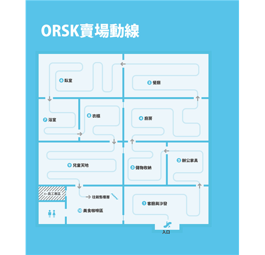 顧客透過高達兩層樓的玻璃中庭進入ORSK家具賣場,然後搭乘電扶梯到二樓,從那裡開始進入迷宮般的展示間。在大陣仗的設計師、建築師與零售顧問的決策之下,展示間樓層要以最理想的方式讓顧客沐浴在ORSK家具的生活風格之中。然而,大批員工到了這裡卻遇上另一個問題:電扶梯移動的方向是往下而不是往上。各樓層銷售人員一路擠進中庭,卻又只能一頭霧水地停在這裡,不知道下一步該怎麼做。技術人員從他們後方擠進來,緊跟在後的還有一整群售後服務員、人資部門以及推車手。很快的,這裡又擠得水洩不通,摩肩接踵,人多到從大門口溢出去了。