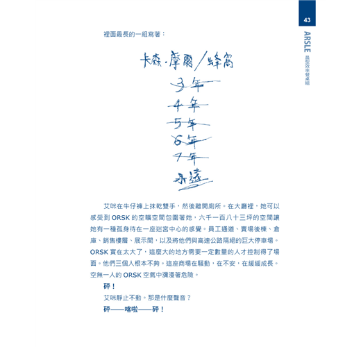 「好的,大夥兒。」她說,同時一邊為貝索擠出微笑,一邊控制自己的慌張。「我的名字叫作艾咪,這裡是展示間樓層。每一位新顧客都是在這裡開啟他們跟ORSK家具之間的關係,所以我們的導覽也要從這裡開始。這間商場大約占地六千坪,我們的顧客將走在閃亮大道上逛這個樓層。」她指著地板上一連串友善的大箭頭。「它的設計目的就是要以最理想的方式引領顧客從入口逛到收銀區。各個區域之間有捷徑可以互通,到了那些地方我再跟你們講。」