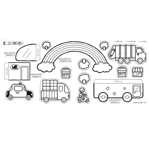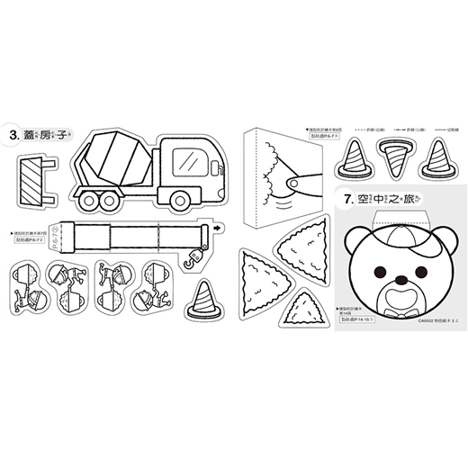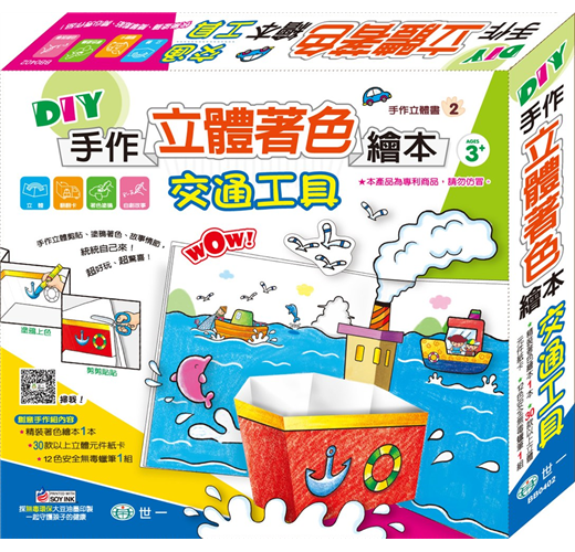 汽車街景、海洋船隻、空中熱氣球及直升機、咻咻火車…等,精緻生動、活潑可愛圖樣讓孩子從手作中認識不同交通工具。以蠟筆上色完畢後,剪下的紙卡,依照上面的清楚標示,折好黏貼於書上,便可以輕鬆完成孩子的第一本自製著色立體書。精裝著色書和紙卡皆透過精心設計,不但圖樣可愛,更是全台灣公、私立幼兒園所首選教育手作繪本書。
