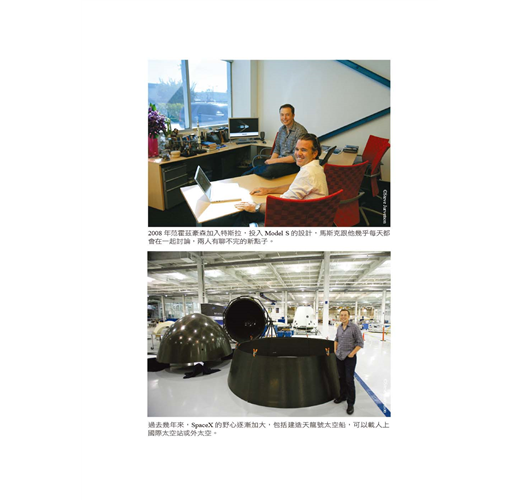 我在特斯拉電動車的設計工作室對馬斯克進行第一次專訪,並開始認識馬斯克的說話方式和他獨特的商業模式。他是個有自信的人,但未必擅長展現這點。初見面,馬斯克可能顯得害羞且幾近笨拙。他還是有南非口音,但已不太明顯,最難以掩蓋的是他說話時特有的停頓模式。