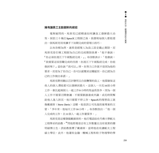 一般是經理人為員工設定截止期限,而馬斯克是引導工程師為自己的完成期限負責。他不會說:「你必須在週五下午兩點前完成。」他會說:「我需要這項很難完成的任務,在週五下午兩點前完成,你能做到嗎?」當你說:「我可以」,你努力工作就不是因為他的要求,而是為了你自己,你可以感覺到這種區別,你已為自己的工作做出承諾。