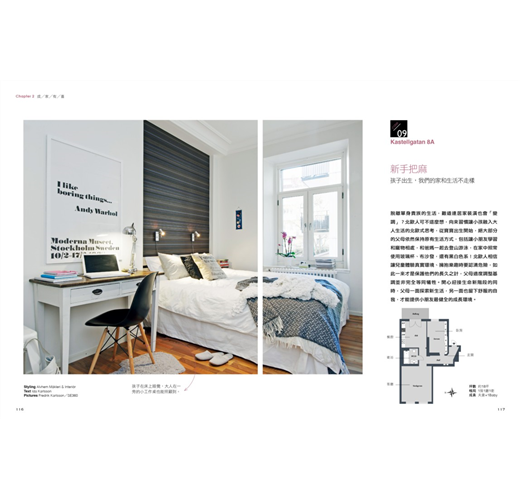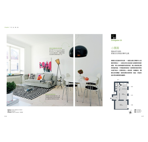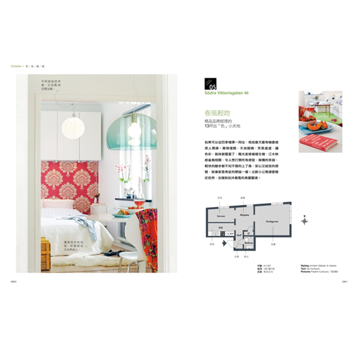 作者盧俞如接觸北歐居家設計產業多年,多次造訪瑞典、丹麥等地,對當地的風土民情、文化生活等有深刻的觀察。這次專訪12個瑞典人家,有醫師、視覺設計師、品管師、織品採購、管理顧問等,有單身貴族、一個人住偶爾伴侶或朋友來訪同住、夫妻、小家庭,介紹他們住的小公寓,藉由200多張案例圖片及平面圖,解析他們如何以「我」或「我們」為出發思考格局與動線規劃,改變空間樣貌,不一定要大肆拆牆大動格局,從順應現有空間格局思考,聽取設計師的建議,加入自己的想法與生活型態,調整空間的缺點變優點,放大原有優勢,保留堪用傢具重新改造,保留變化的彈性設計。讓家的空間隨著成員一起成長,享受生活中人與人、人與空間的互動樂趣。