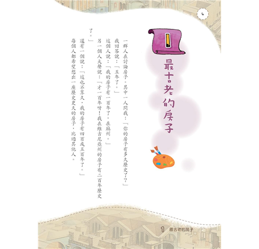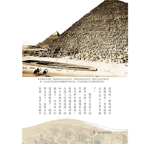 我不肯認輸,說道:「我還知道一座房子比這更古老。我曾經去過一座蓋給死人的房子,有五千年歷史了,在埃及,大家叫它金字塔。」