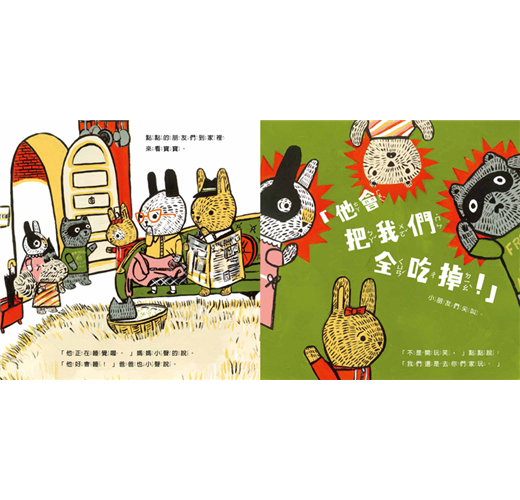 不被信任的狼寶寶需要更多的理解與陪伴,看似處於弱勢的兔子則在一場危機中展現勇氣與智慧反成為狼寶寶的保護者。圖文的絕妙搭配,展現十足的情緒張力,上演着文字外的故事,簡潔的文字更是適合大聲朗讀。──新竹市大湖國小閱讀老師 吳文玲