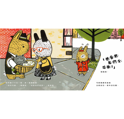 家中添成員時,父母和小孩的反應不一樣,爸爸媽媽滿心歡喜,而老大容易因父母關愛眼神轉移到新生兒身上,因而對新成員產生排斥和嫉妒的心裡。本書以「狼寶寶」來合理化小兔子對新生兒不滿的情緒,也以兔子爸媽一再漠視小兔子發出的警語—「他會把我們吃掉!」,來詮釋父母對老大的忽略。在一次危機中,小兔子拚命保護「狼寶寶」並成功趕跑大熊,讓小兔子有身為兄長的驕傲感。本書很能引起「老大」的共鳴,並陪伴「老大」適應有弟弟妹妹的新生活,也提醒家長照顧新生兒的同時,也記得關愛「老大」。──新北市書香文化推廣協會理事長 蔡幸珍