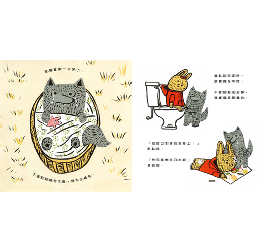 《狼寶寶》的故事說訴孩子們在面對家中新成員時,既抗拒又不放心的感受。就跟點點的感覺一樣,明明狼寶寶很危險耶!兔爸爸和兔媽媽卻被他的可愛外表沖昏頭,一味忙著喀嚓喀嚓搶拍照。不管點點再怎麼說,爸爸媽媽就是沒有聽到。而且,還不斷稱讚狼寶寶什麼事都做得好棒!一方面,點點原本作為家裡唯一孩子的地位受到威脅;另一方面,她走到哪裡,狼寶寶就跟到哪裡,不論她去上廁所〈狼寶寶跟到廁所〉,或者在畫圖〈狼寶寶把口水滴到她的圖畫上!〉,討厭的狼寶寶都跟進跟出,這活脫脫真是家裡有了新生弟弟妹妹孩子的心聲。本書的作繪者充滿幽默感:作者讓兔家庭撫養狼寶寶,在故事情節的發想演進上,自然會衍生諸多趣味與張力。畫家描繪的兔子姊姊點點與狼寶寶弟弟除了造型實在可愛,彼此間還產生對照的喜感。原本應該充滿威脅性的狼,從頭到尾都是無辜純稚的模樣;而平日給人溫馴印象的兔子,在點點身上完全是另一番樣貌,點點總是穿著紅色連帽外套,氣呼呼的一副警戒狀態,就連狼寶寶在蔬菜店遇見壞熊,指給姊姊看時,點點都拿出紅蘿蔔自我防衛,實在是一隻很有個性的小女生兔子。
