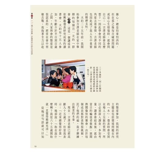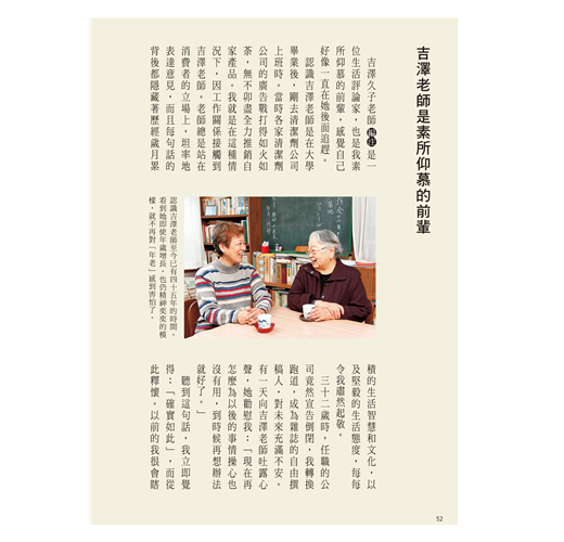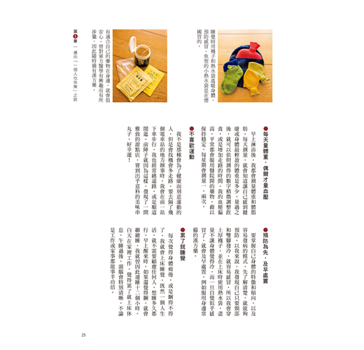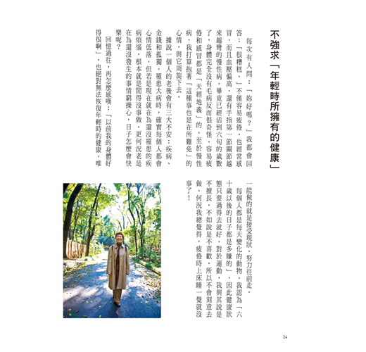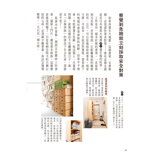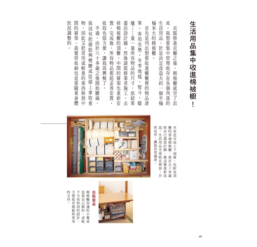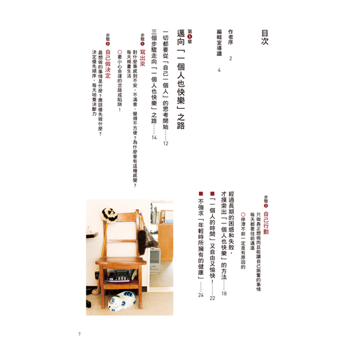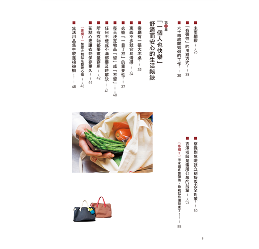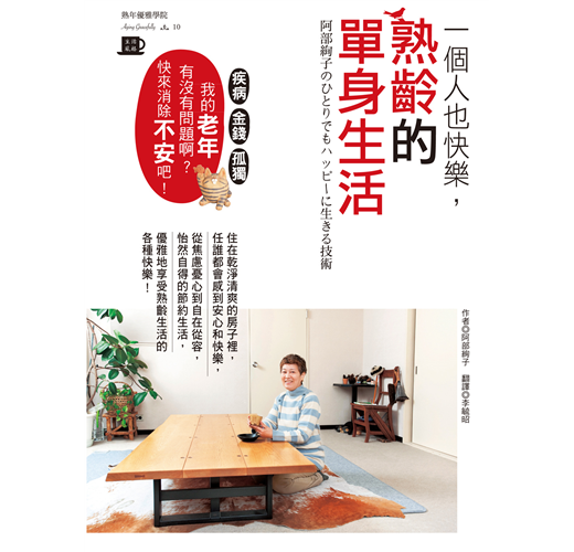 她在書中建議,趁著50歲還有體力時,徹底做一次居家大改造,並且重新安排吃的、用的、穿的:改用小冰箱就不會囤積食物;常用的生活物品統統改放在理想的高度與位置;沒有體力再做換季收納了,將所有衣物都分類好,全部掛起吧!熟齡的心靈、體力和經濟都有限度,把生活安排好,不安自然就會消除,過個快樂的熟齡單身生活。