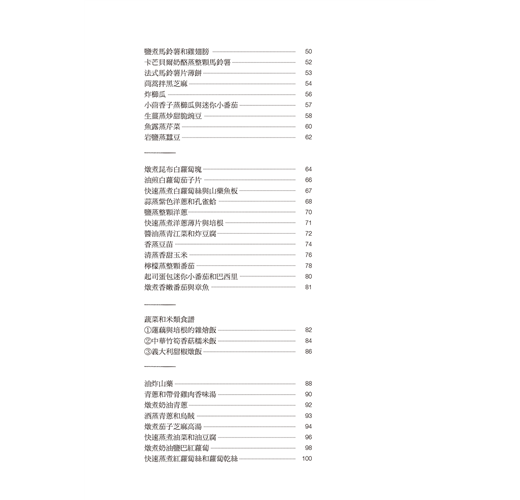 這本書收錄滿滿的將食材的個性活用做出簡單又美味的料理食譜。用家中現有的食材快速烹煮也是其魅力。將蔬菜與橄欖油放入,加入鹽巴,蓋上鍋蓋,開火!就這麼簡單,最後更附上各種「蔬菜烹調時間一覽表」,好方便!請一定要參考本書,體會最美味的蔬菜料理!」