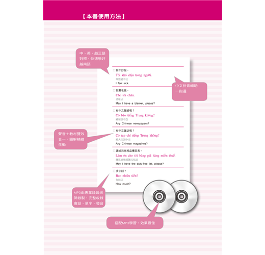 為加強學習效果,搭配MP3,學習純正道地的越南語,有助你掌握標準的發音技巧,加強聽說能力,跟著老師的發音,講出最標準的語調,只要反覆練習,自然能說一口流利的越南語。