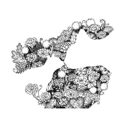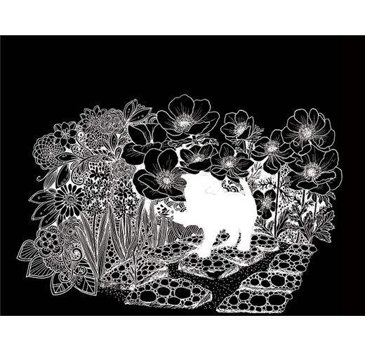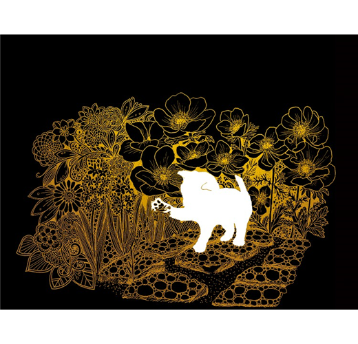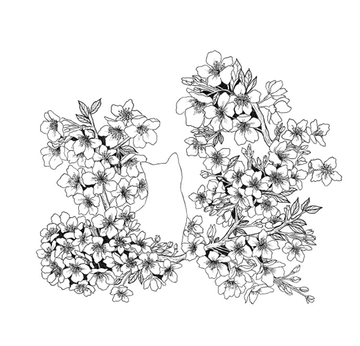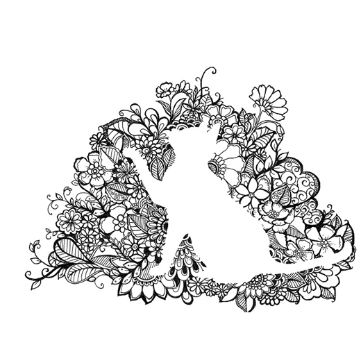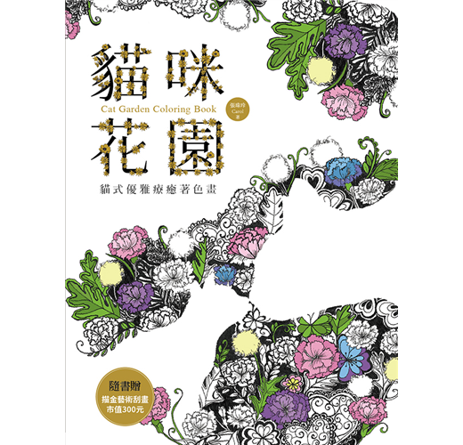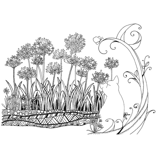 以繁複的花叢、窗台、圍籬、鄉間小路…為背景,一緊一鬆,烘托出貓咪優雅身影、神祕的氣質。圖片中貓咪空白的位置,可依個人想像,畫上各種不同花色的貓咪模樣,留白不上色也是另一種獨特風格。