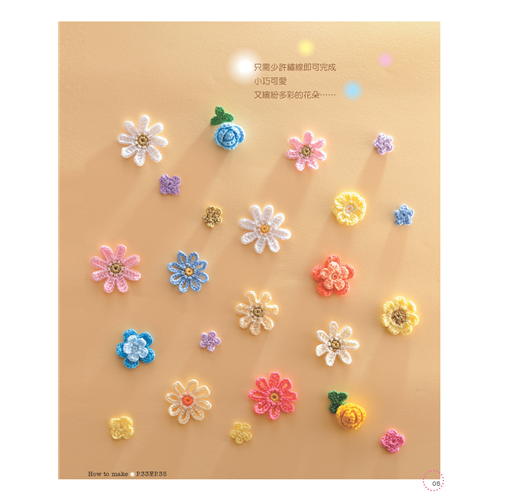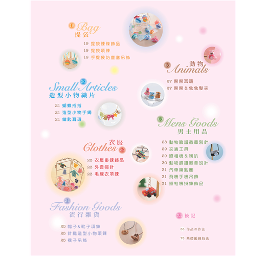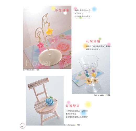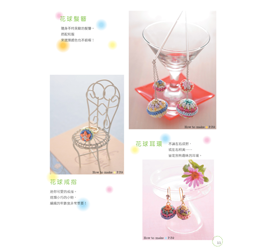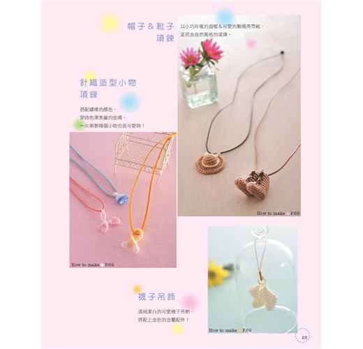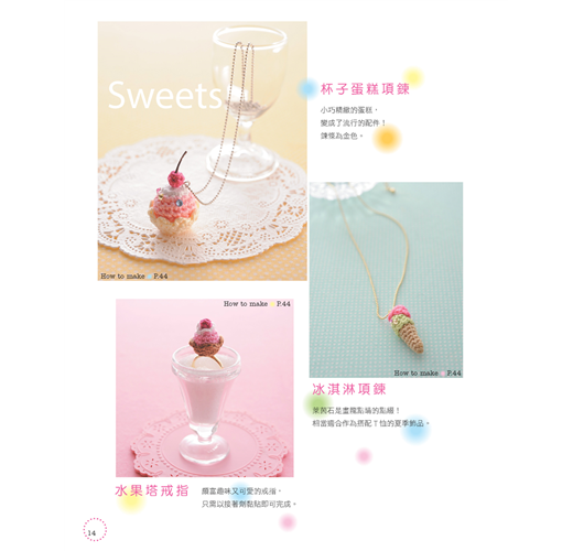 將一個個小巧的作品,與飾品五金配件結合,就能作出髮飾、耳機防塵塞、徽章、項鍊、戒指……等各式各樣充滿趣味的飾品小物。只需利用比一般鉤織時更少的時間,就能完成可以立刻使用的小作品,相當適合作為零碎時間的手作選擇。