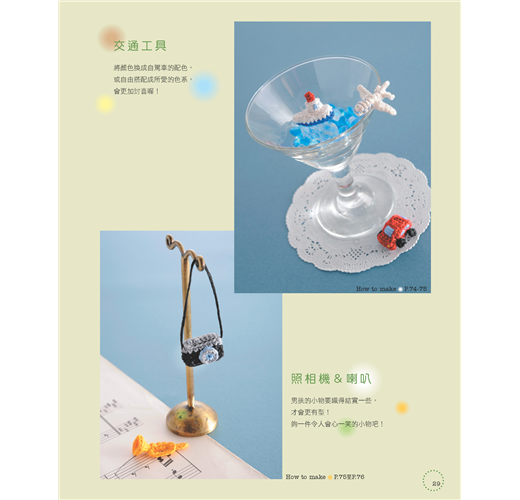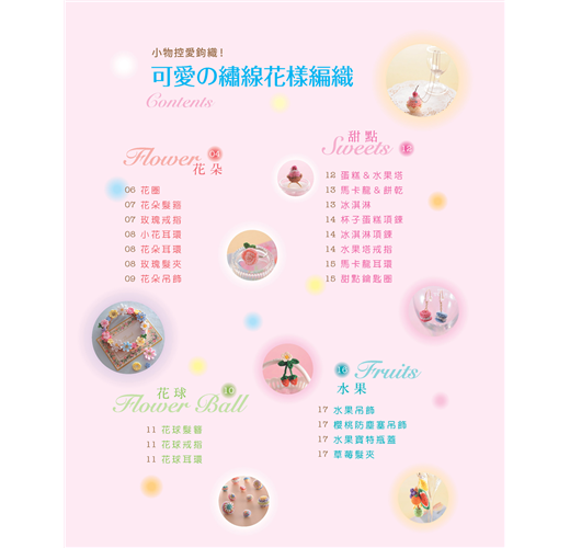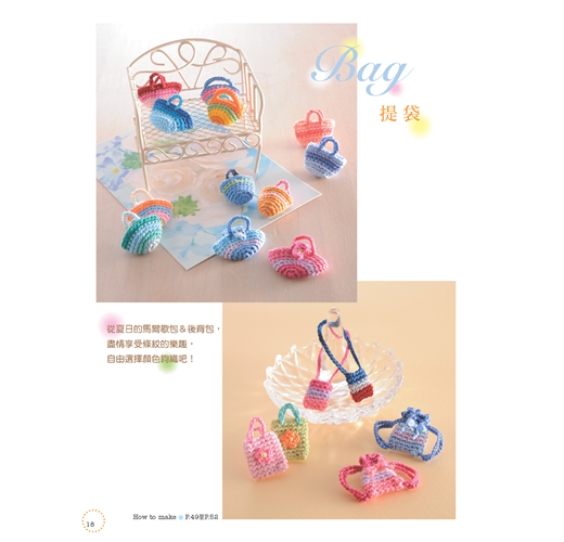 以繡線為素材,運用鉤針的編織技巧,鉤織出可愛的織片&立體的造型小物,如花朵、甜點、水果、動物、交通工具、相機、衣飾雜貨……全都是超迷你的尺寸!作品帶有織物特有的溫暖氣息及觸感,可是療癒力十足呢!
