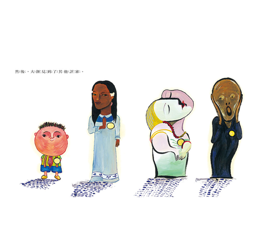 仔細看,其他三位評審竟然是畢卡索、孟克、高更的畫中人物!他們代表了西洋美術史上不同畫派的畫風,而書中參加比賽的動物,牠們的畫其實也跟一些名畫作品相似喔,可以和孩子一起從名畫中,找找那些色彩鮮艷的點點、粗曠簡明的線條、還有多彩的方格子色塊!