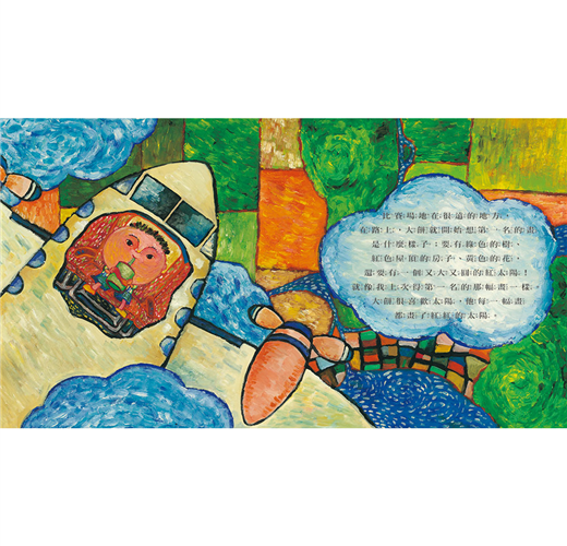 大餅認為畫畫一定要有紅太陽才好看,但是來參賽的作品都太奇怪了……小狗的畫沒有紅色、蜻蜓的畫都是點點、毛毛蟲畫裡的花一點都不像花?「大家都畫錯了!」大餅忍不住大叫……可是,真的是這樣子嗎?