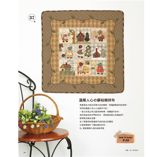 可愛的鬱金香、溫暖人心的蘇姑娘、帶來幸福的青鳥、令人嚮往的小房子、童趣感十足的小綿羊等,有別於一般拼布的沉穩氣質,她以極具輕鬆生活感的獨特設計,創作出格外年輕、活潑的拼布作品,即使是較為剛硬的傳統圖形,在柴田老師的巧思配色下,也能呈現出不同於以往刻板印象的可愛面貌,她相信布料擁有讓人幸福的魔法,只要動手創作,就能夠將幸福的能量傳遞至世界上的各個角落,希望喜愛拼布的手作人們,也能跟她一樣,以「獨一無二的拼布」將這樣的幸福力量感染給身邊的每一個人!