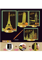 內容包含:世界著名城市地標--英國大笨鐘、巴黎鐵塔、比薩斜塔、俄羅斯克里姆林宮,每組中有一枝專屬的刮畫筆。