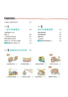 介紹基本筆法及概念,有助於初學者熟悉線條與色彩的應用。舉例示範各種線條樣式,以及用咖啡杯和禮物盒教你簡單的透視原則;使用水性色鉛筆時要如何疊色和暈染,以增加實物的立體感等等。