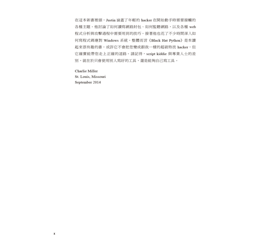 在《黑帽 Python》這本 Justin Seitz (熱銷書《Gray Hat Python》作者) 的最新著作裡,您將探索 Python 威力中較黑暗的那一面 — 撰寫網路監聽程式、對封包動手腳、感染虛擬機器、製作隱形木馬等等。