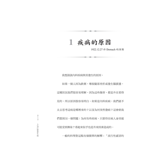 藉由史代納博士在19至20世紀初時的演講內容,帶領你從人智學醫學角度探討,從康復的過程中了解讓我們的內在生命進步,從死亡的歷程影響外在世界的進化。唯有開啟你的內心,從最深處的心靈去探索,我們才能知道「人為什麼會生病」。