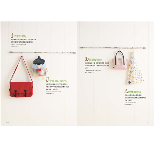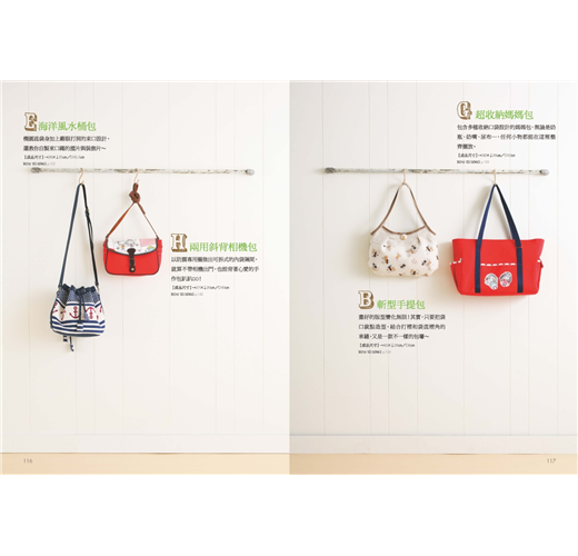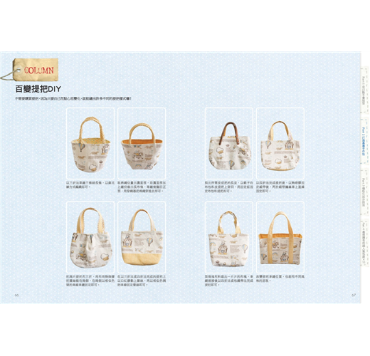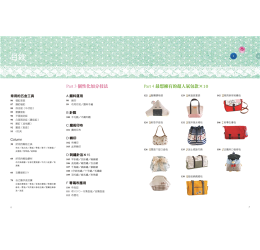 5.實作示範包款超過30種以上,書中亦收錄各種布包變化或裝飾技法,供讀者學習應用。