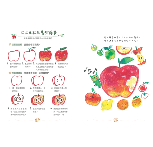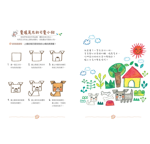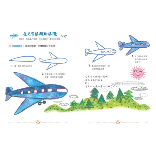 學會畫出圖案後,就可以輕鬆組合各種元素,形成一幅有趣美麗的圖畫,用圖畫引導小朋友的想像力。