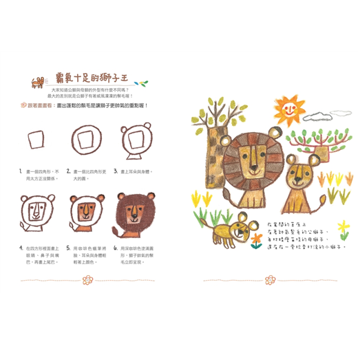 空白的畫紙上,你想畫什麼呢?來畫獅子好了,「獅子在森林裡,有獅子爸爸、獅子媽媽,還有一隻小獅子寶寶,一家人在圍繞著樹木與草地上的森林裡曬著太陽。」教小朋友畫出獅子、樹木、草地、花朵、太陽、雲朵,組合出一幅充滿故事性的圖畫。