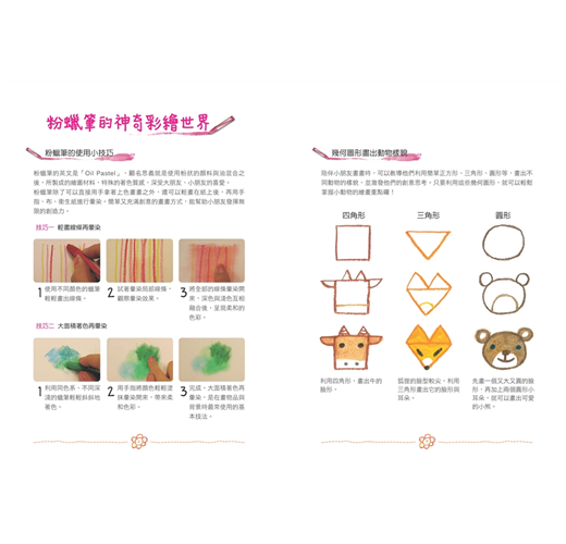 動物該怎麼畫呢?好像很難耶,其實一點都不會喔!利用正方形、圓形、三角形,就能畫出具體的輪廓。像是狐狸的頭是三角形、牛的頭是四邊形、熊是圓形。在學習形狀的同時,也可以幫助孩子觀察各種動物不同的樣貌,激發他們的創意思考。