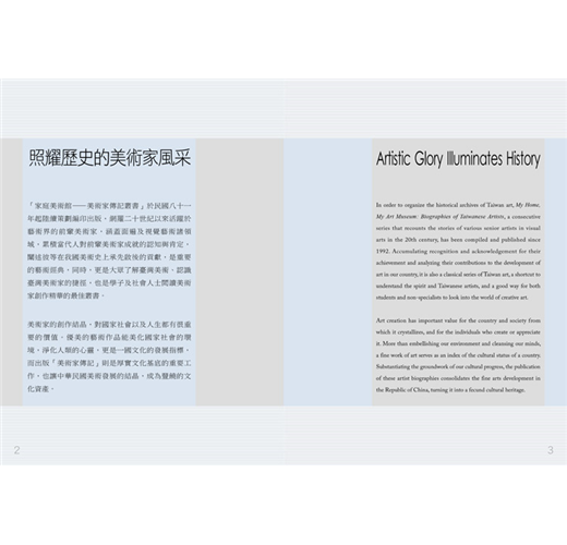 美術家的創作結晶,對國家社會以及人生都有很重要的價值。優美的藝術作品能美化國家社會的環境,淨化人類的心靈,更是一國文化的發展指標,而出版「美術家傳記」則是厚實文化基底的重要工作,也讓中華民國美術發展的結晶,成為豐饒的文化資產。