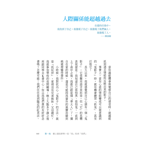 書裡主要是談廣泛的人際關係——人生來孤獨嗎?或許我的心裡一直有這樣的想法,讓我從小到大一直逃避積極與人互動。然而,當我在深夜靜心地閱讀皓宜的文字,那句句撼動我心的隻字片語「與人建立關係,是生命中最重要的本能」「人我之間的偶然每天都在發生,能夠被我們覺察且保留下來的卻寥寥無幾,其實世界上每一種相遇都有獨特的意義」「當感受有所覺察,情節就得以被認識」「人際關係本身,就是一種尋找外在對象來滿足內在基本需要的過程。」…… 我才發現皓宜所說的,透過人際關係的互動,我們能了解自己,擴大內在靈魂的能量,也能了解不同於自己的存在,開啟新的創造、靈感與知識,產生被滋養的喜悅。原來我一直以為人際的互動,在於證明自己的魅力與對群體肯定的渴望,一直沒有自信的我,才會充滿了恐懼。皓宜卻在書裡用生活中平凡又不平凡的對話讓我明白,越是具挫折感的人際關係,越是認識自我、覺察自我的好機會,這像是為我打開了一扇門,讓我不再害怕面對無法預測、無法控制的人我關係。