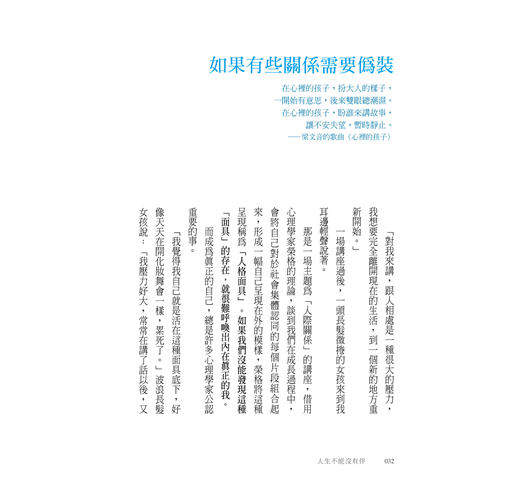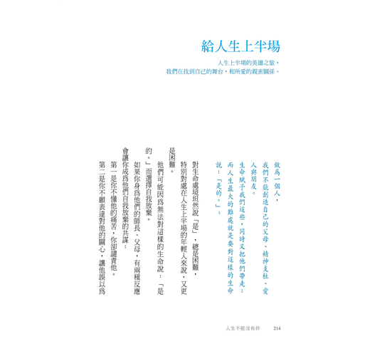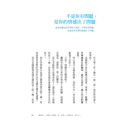 所以她離開諮商專業系所的教學,真誠地回到自己初衷所愛的書寫——以一種面對人心的深刻與同理。她的口吻直接而犀利,筆調溫暖而幽默,從自己、父母到周圍的人,以及許許多多的關係,寫出了發生在我們內心深處的故事,也記錄了我們記憶中不同典範的關係。