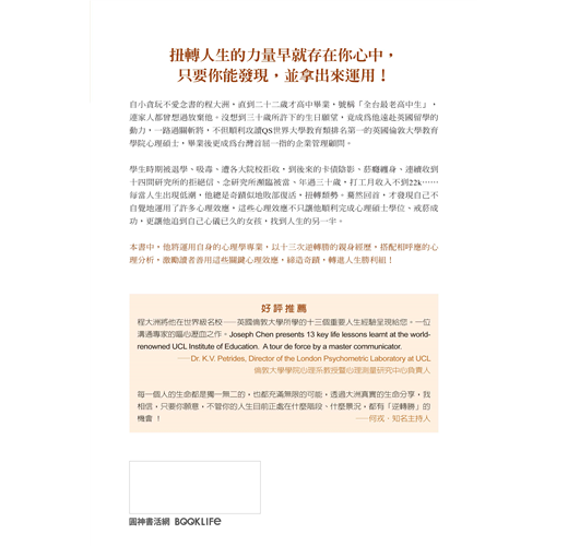 所以,你相信嗎?十年後,三十二歲的我,正準備攻讀一所擠下哈佛、牛津、劍橋等名校,躍升成為教育界世界排名第一的教育學院之碩士學位。這次,我不只真的順利畢業,取得了英國倫敦大學教育學院心理碩士學位。畢業後,甚至還順利在倫敦找到了正職工作,取得高技術移民簽證,期間還曾獲得外交部報導、英國國家廣播電台(BBC)專訪以及倫敦區最佳團隊經理人等殊榮。旅居英國七年後,舉家搬回台灣,除了成為培訓超過數百家頂尖公司的專業企管講師之外,也是Apple、facebook、微軟、華為等頂尖企業指定之英國優勢測評Strengthscope®的台灣首席國際分析師。同時,也為《親子天下》撰寫專欄及獲邀受《真情部落格》專訪,以及擔任《幸福來敲門》等節目嘉賓。