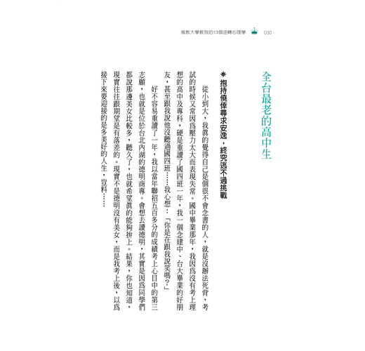 學生時期被退學、吸毒、遭各大院校拒收,到後來的卡債陰影、菸癮纏身、連續收到十四間研究所的拒絕信、念研究所瀕臨被當、年過三十,打工月收入不到22k……每當人生出現低潮,他總是奇蹟似地敗部復活,扭轉頹勢。驀然回首,才發現自己不自覺地運用了許多心理效應,這些心理效應不只讓他順利完成心理碩士學位、戒菸成功,更讓他追到自己心儀已久的女孩,找到人生的另一半。