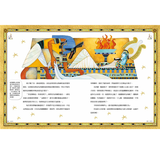 每位賓客都輪流躺進箱子,但他們不是太矮就是太高,不是太胖就是太瘦,烏西爾的體型卻剛剛好。那當然,因為賽特早就趁哥哥熟睡時,量好了他的身材,然後按照尺寸訂做這只箱子。