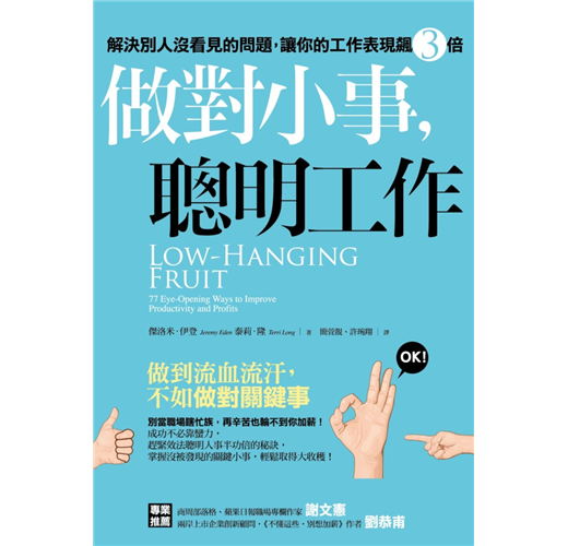 大膽創新並非是成功的唯一法門,許多減少浪費、創造好表現的改革,其實來自於換個角度思考,發現顯而易見的解方,只是許多人缺乏辨識出問題的眼光。本書會引導你找出那些低垂的果實,你不必冒險挑戰難關,只要做對小事,就能積少成多取得大收穫,達成亮眼的表現!