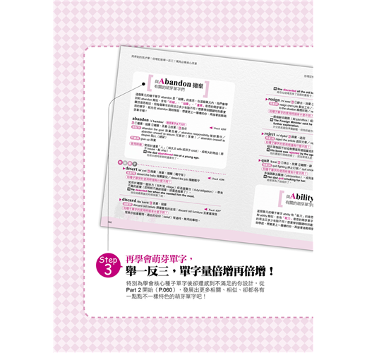 STEP 3收穫:最後利用本書詳細無比的單字差異解析,學習每組意近單字之間有何不同、各該用在什麼情境。從此單字用得精準、說得道地,不再生硬表達、直白地中翻英!