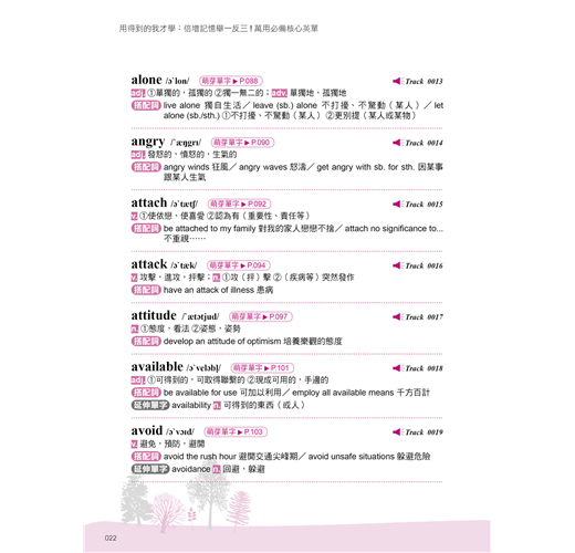 全書單字皆附上最基本的音標、詞性,更溫馨附上「搭配詞」,也就是常與此單字一起出現的詞語或片語,更有助於瞭解每個單字的實際用法。當然,別忘了專業外師親錄的MP3,方便輕巧,讓你走到哪裡都能沉浸在單字的世界中。沒事就想記單字?就靠這一本準沒錯!