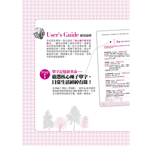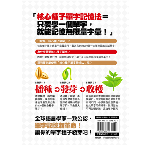 本書採取獨特的雙層式編排法,為大家先列出順暢表達意思極為必要的關鍵200種子單字,讓初學者與沒時間的人先與它們培養感情。若你已搞定這200個字,再來一一認識它們的無數個萌芽單字小夥伴……如此符合不同需求的學習,肯定事半功倍!
