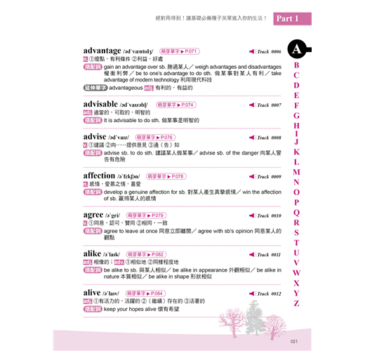 擁有單字書的人何其多,真的從A一個字一個字背到Z的人我敢說絕對沒有。這樣對Z開頭的單字不是太不公平了嗎!這本書的編排方式大不同,讓你有系統地學習意思相近的單字。舉例來說,大家可能都學過question(問題)這個單字,但你知道complication、nuisance、plight等等都是和它意思相近的夥伴嗎?這本書幫你一次全部不知不覺就學起來!